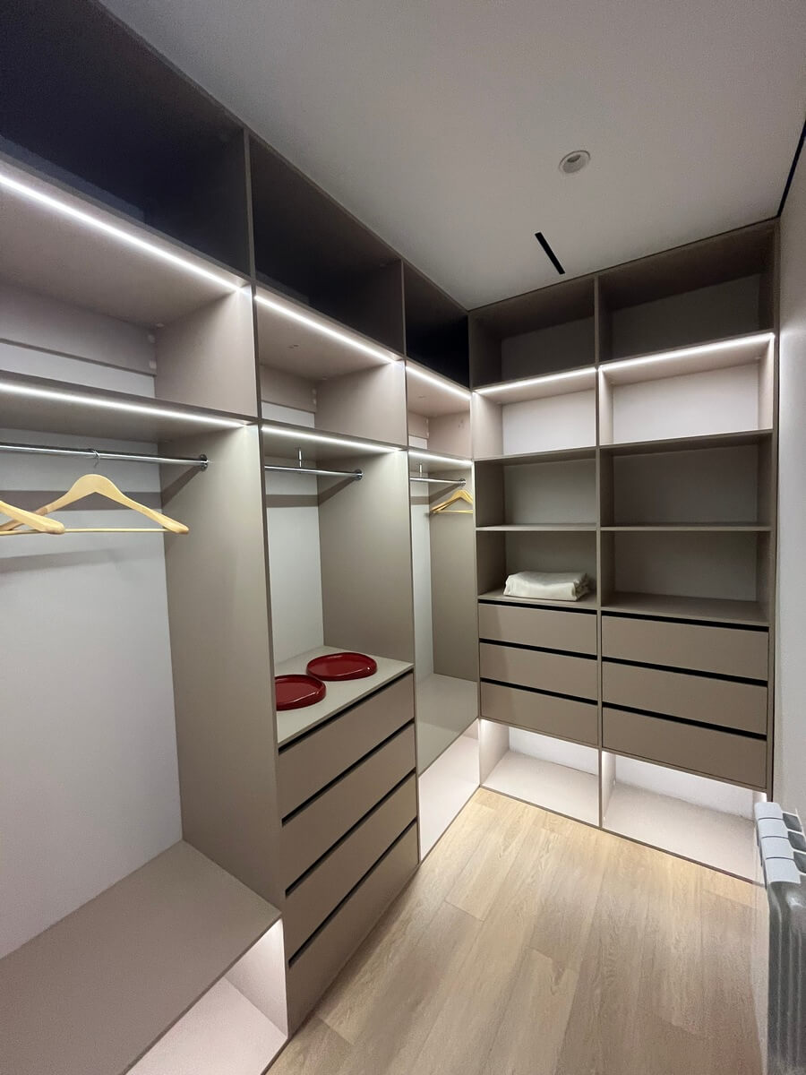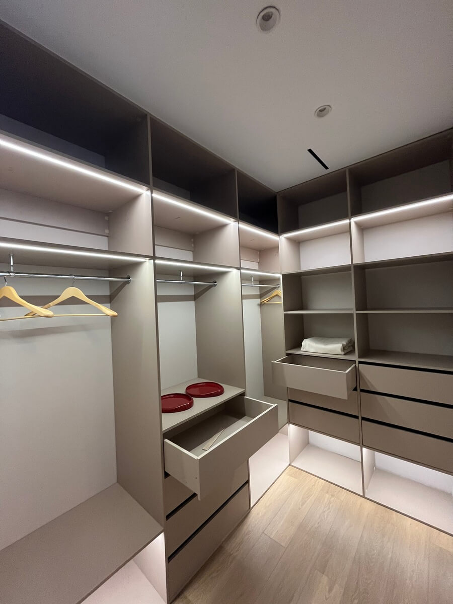 Г- образная гардеробная в цвете U702 ST9 Кашемир серый. Гардеробная оснащена полками, штангами, ящиками и светодиодной подсветкой.