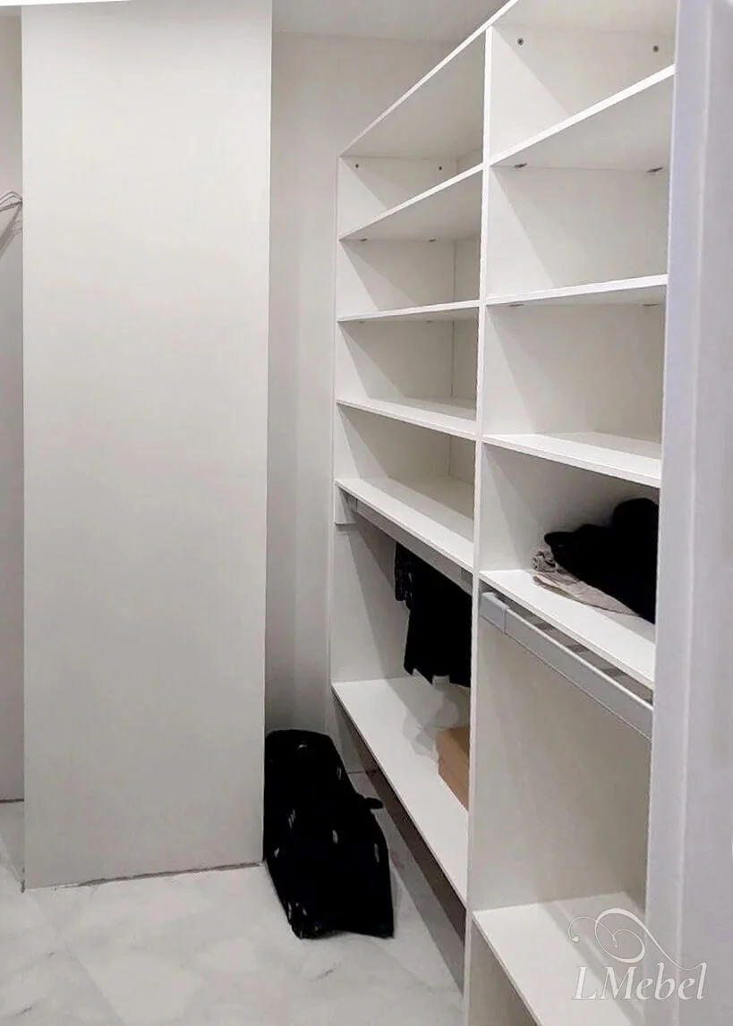 Выполнена из ЛДСП в цвете белый премиум шагрень W1000. Для наполнения использованы глубокие открытые полки, брючницы и штанги, где можно хранить вещи на тремпелях.