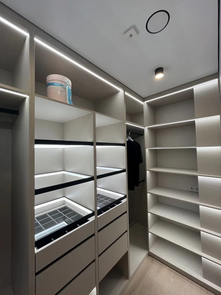 Г- образная гардеробная в цвете U702 ST9 Кашемир серый. Гардеробная оснащена стеклянными полками, ящиками для бижутерии и светодиодной подсветкой.