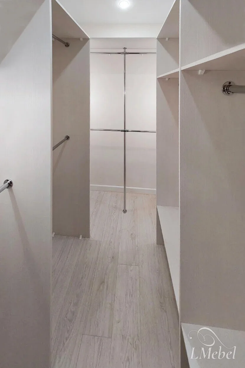 Внутреннее наполнение из открытых полок и штанг для одежды на плечиках поможет организовать удобное место для хранения даже в небольших помещениях. Классическая светлая расцветка визуально расширяет внутреннее пространство.