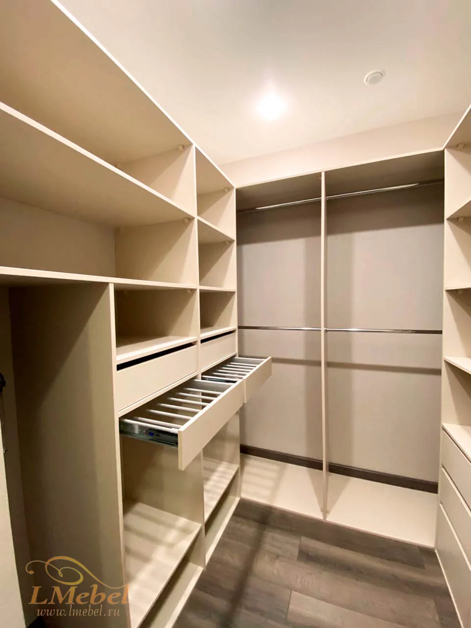 Большая П-образная гардеробная в цвете крем-беж обладает прекрасной вместительностью и функциональностью. Структура включает в себя 8 секций, 28 полок, 5 штанг для вешалок, 9 ящиков и 2 брючницы STARAX, предназначенные для аккуратного хранения брюк. Это решение идеально подходит для организации и хранения большого количества одежды и аксессуаров, обеспечивая легкий доступ к вещам и их сохранность. Гардеробная разработана с учетом требований к долговечности и эргономике. Для изготовления корпуса использованы высокопрочные плиты ЛДСП, устойчивые к механическим повреждениям и повышенной влажности. Возможно изготовление аналогичной модели в любом цвете.