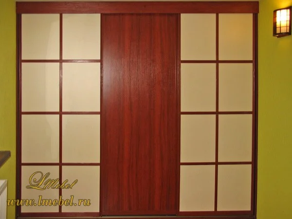 Встроенный шкаф выполнен в японском стиле. Основа шкафа ДСП красное дерево, две боковые двери выполненные из светлого ДСП позволяют зрительно облегчить шкаф, а разделители в цвет шкафа подчёркивают японский стиль. Боковые двери выполнены из ДСП цвета ваниль с наклеенными вертикальными и горизонтальными разделителями под цвет шкафа.