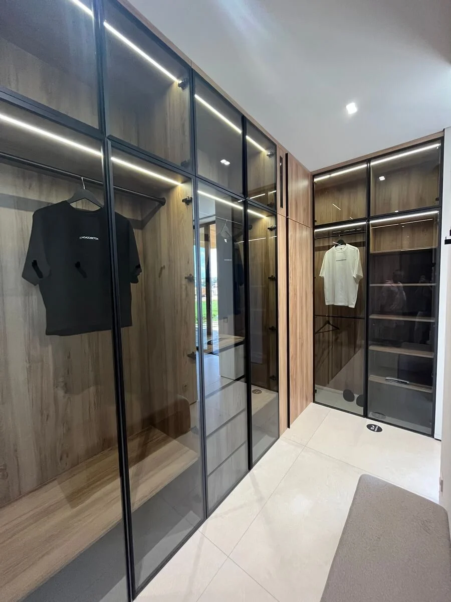 Стеклянные вставки на фасадах добавляют лёгкости и воздушности пространству, визуально расширяя его. Чёрный профиль дверей контрастирует с натуральным деревом, создавая стильный акцент.