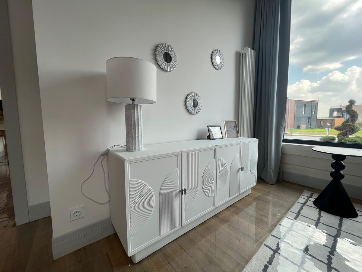 Тумба выполнена из крашенного МДФ. На дверях выполнена фрезеровка «галтель» в форме кругов.