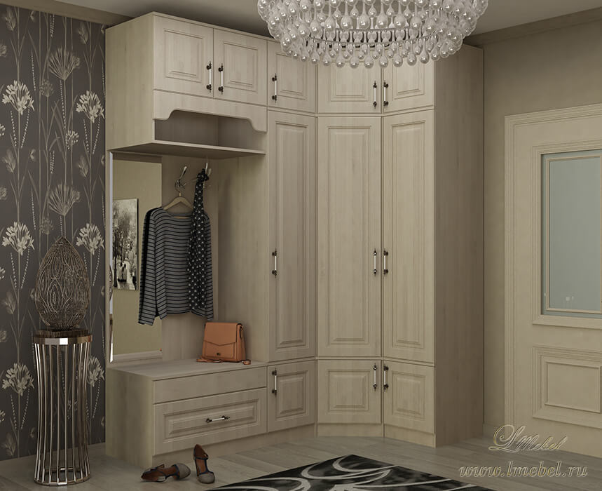 Бежевый угловой шкаф с фасадами из МДФ. Для создания дверей использованы мебельные плиты цвета светлой акации, корпус изготовлен из ДСП такого же оттенка. Глубина боковых шкафов — 45 сантиметров, а глубина угловой секции составляет 130 сантиметров. В базовом варианте в ней установлены полки и штанги для одежды. Функциональное наполнение можно расширить выдвижными корзинами или вращающимися подставками для обуви.