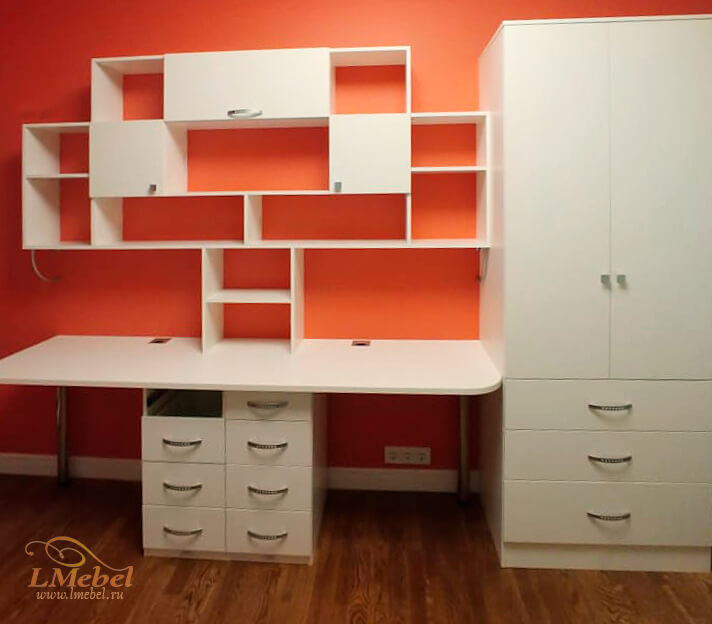Большой стол на 2 рабочих места. Распашные фасады выполнены из ЛДСП цвета W980 Белый платиновый шагрень. Состоит из 1 полки, 1 штанги, 11 ящиков и открытой секции с полками.
