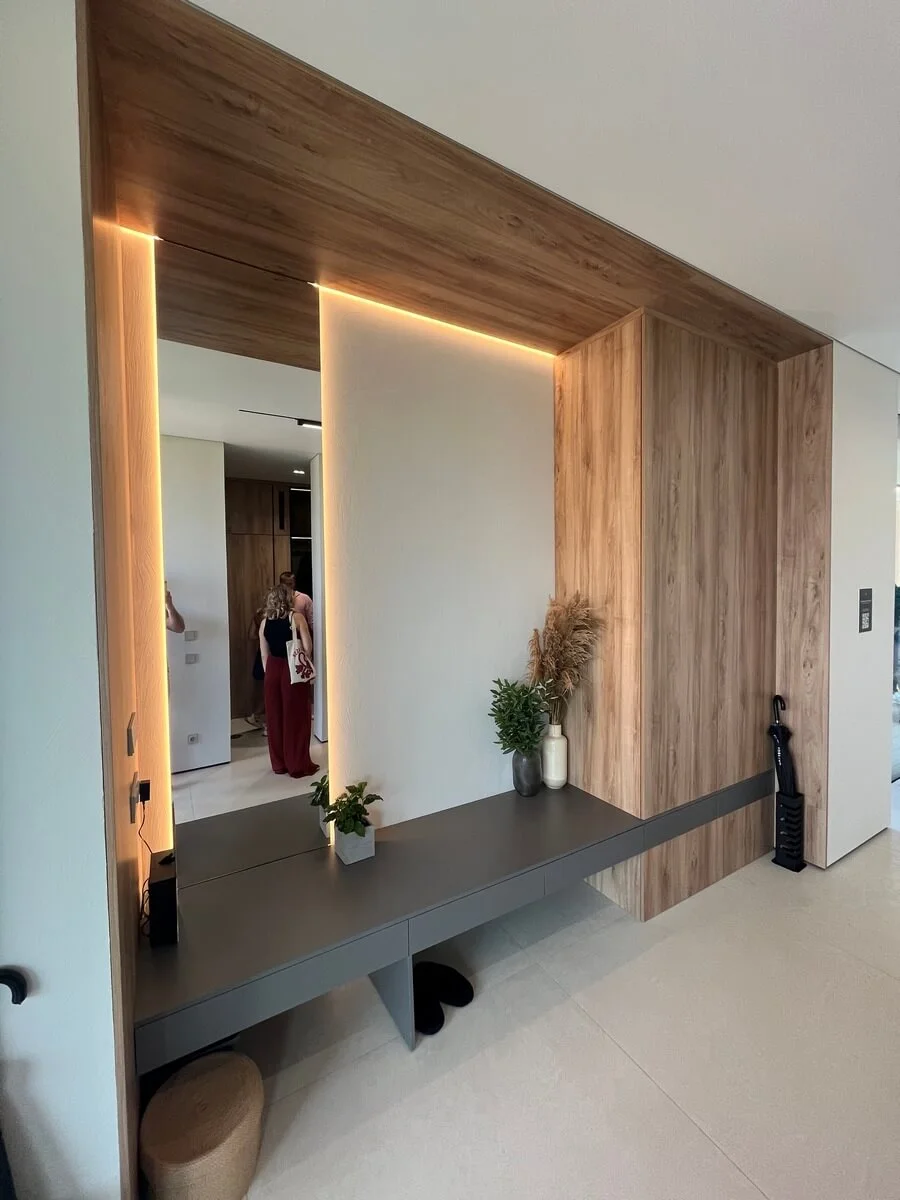 Этот дизайн прихожей сочетает в себе функциональность, современный стиль и тепло натуральных оттенков, создавая идеальное первое впечатление о доме.