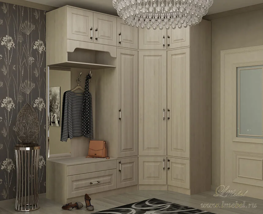 Светлый угловой шкаф для прихожей. Конструкция выполнена в классическом стиле, двери изготовлены с использованием рамочного профиля и декорированы комбинированными ручками. Корпусные элементы можно менять местами, что позволяет использовать шкаф в разных помещениях. Например, при переезде его можно забрать с собой в новую квартиру.