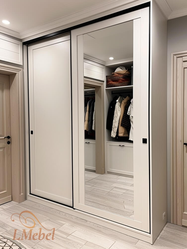 Шкаф-купе с белыми МДФ фасадами и зеркалом — стильное решение для светлых интерьеров. Черный профиль подчеркивает геометрию и добавляет контраста. Внутри предусмотрено 2 секции с полками, штангами и ящиками для удобного хранения. Модель сочетает эстетику, вместительность и надежную фурнитуру для ежедневного использования.