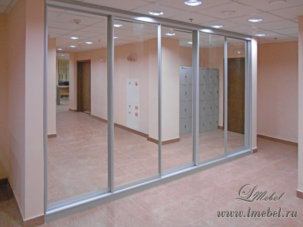 Зеркальный встроенный шкаф-купе для офиса. В шкафу установлены пять продольных штанг, которые позволят разместить на плечиках одежду, как сотрудников, так и гостей офиса.