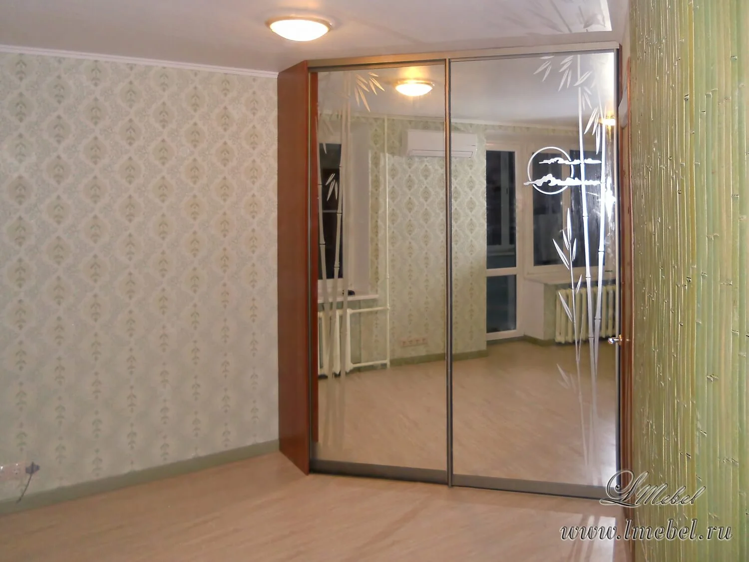 Зеркальный угловой шкаф-купе со стеклянными дверьми. Особая конструкция и многофункциональное наполнение делают шкаф похожим на полноценную гардеробную. Внутри установлены полочки, выдвижные ящики, штанги разной высоты. Зеркальный фасад декорирован с помощью пескоструйных рисунков.